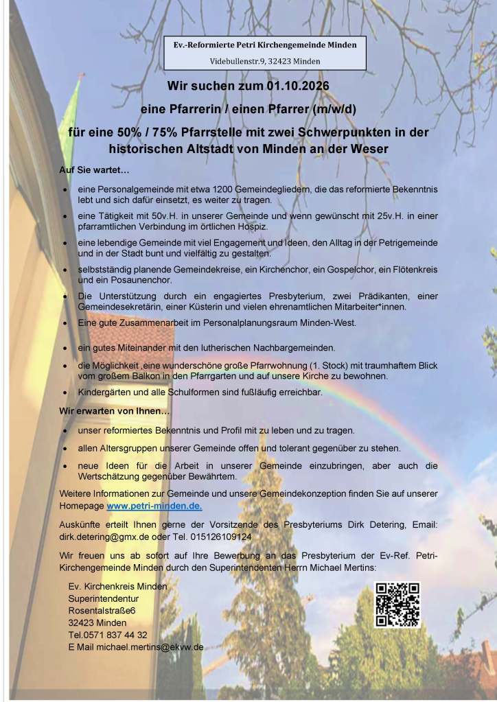 Da unser Gemeindepfarrer, Pastor Roman Groß, zum 30.09.2026 unsere Gemeinde verlässt, suchen wir eine neue Pfarrerin / einen neuen Pfarrer.